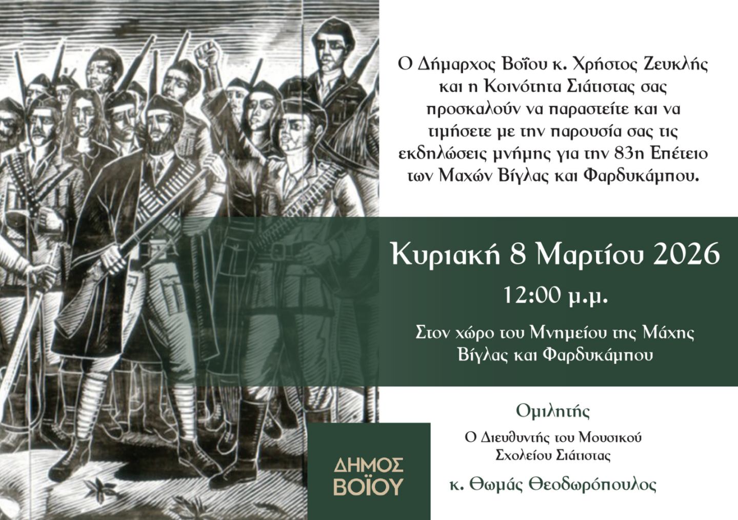 Ο Δήμος Βοΐου τιμά την 83η Επέτειο των Μαχών Βίγλας και Φαρδυκάμπου, αποδίδοντας φόρο τιμής στους αγωνιστές που υπερασπίστηκαν με αυταπάρνηση την πατρίδα.