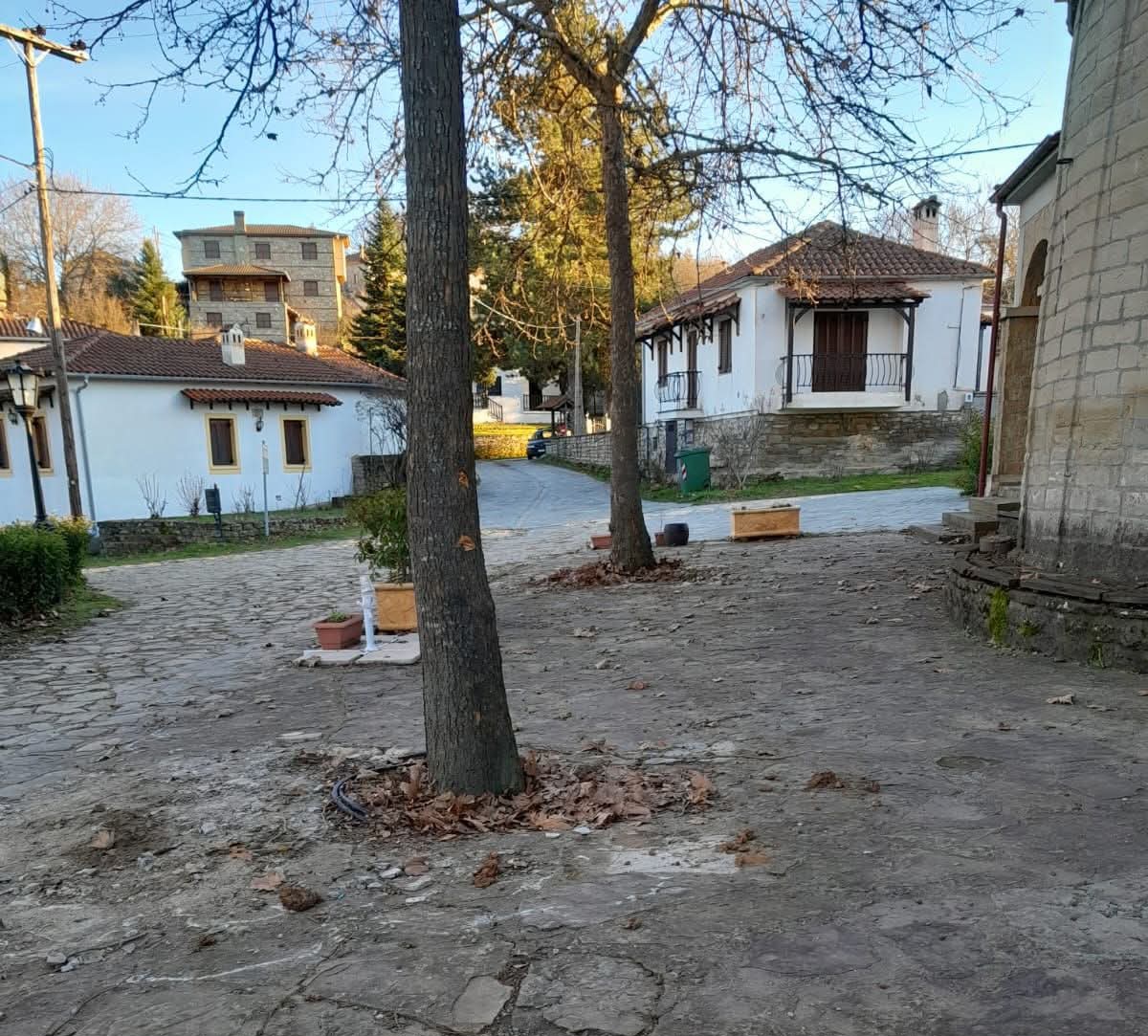 Η πλατεία του χωριού μας σήμερα: Τα παγκάκια μπροστά στην εκκλησία ξηλώθηκαν από τον δήμο, μετά από μήνες προσχηματικών καταγγελιών και απειλών μιας ομάδας που θέλει οπωσδήποτε να φύγει από εδώ μια μικρή επιχείρηση εστίασης που άνοιξε πριν πέντε χρόνια, και χρησιμοποίησαν και αυτά τα καθίσματα σαν αφορμή για καταγγελίες (τους άκουσα η ίδια να φωνάζουν με ύφος μαφιόζου: να το κλείσουμε, να το κλείσουμε!).