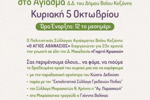 Δήμος Βοΐου: 23η Γιορτή Κρασιού στο Αγίασμα από τον Πολιτιστικό Σύλλογο Αγιάσματος Βοΐου «Ο ΑΓΙΟΣ ΑΘΑΝΑΣΙΟΣ»